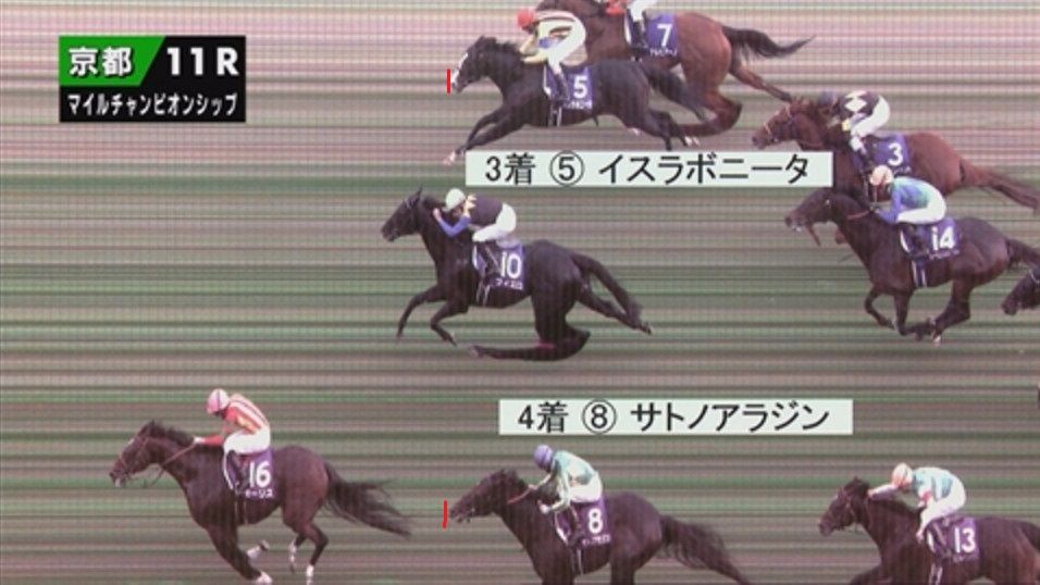 写真判定。完全にサトノアラジンが3着だと思いましたが、写真判定で見ると1mmくらいの差なんじゃないかというくらいの接戦でイスラボニータが先着してました。赤の線にわずかに触れているのがイスラ。触れてないのがサトノ。ほんとに1cmもないだろうくらいのわずかな差でした
