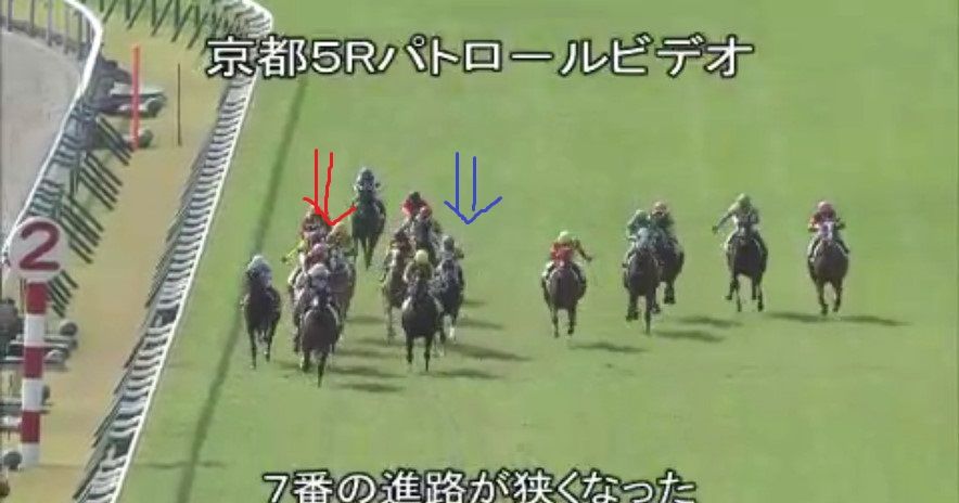 結局激しく接触し、岩田騎手の外にいたもう一頭の黄色帽子の馬もここで外に振られてしまいます