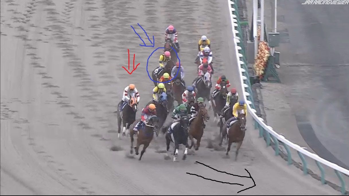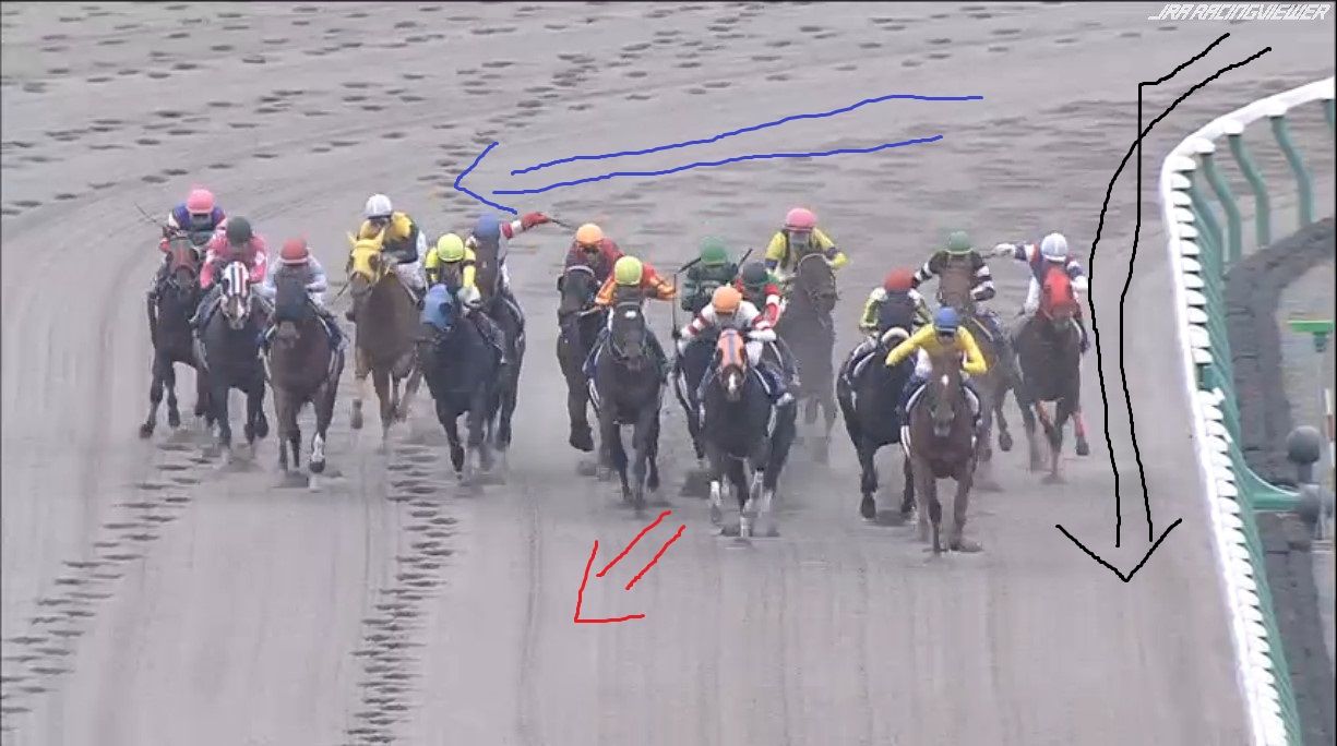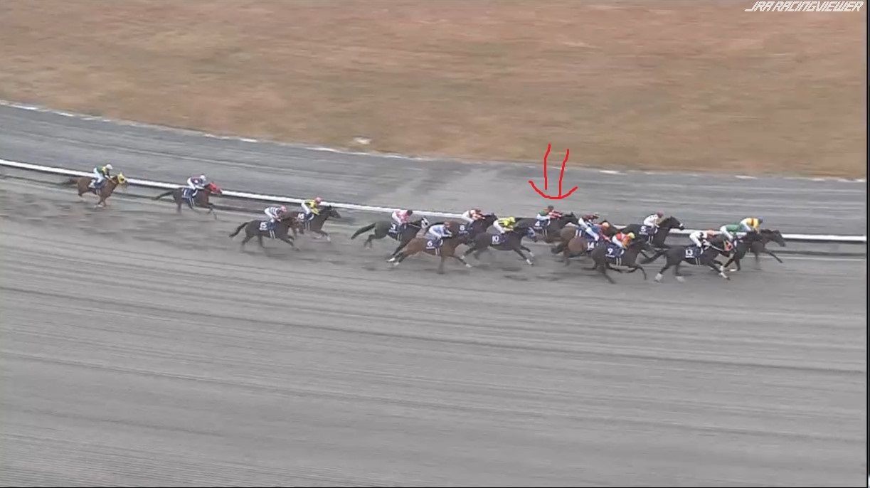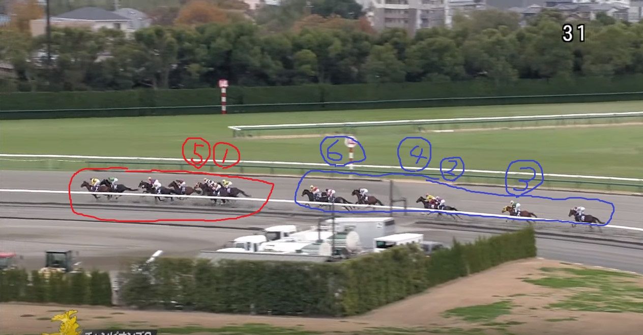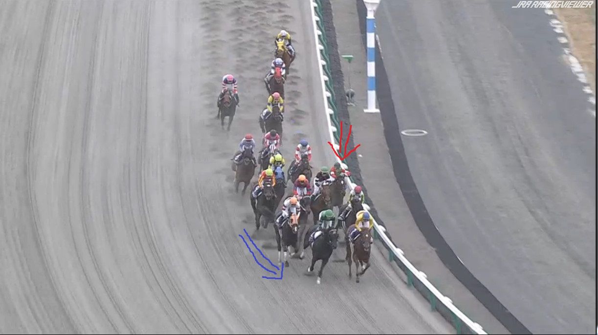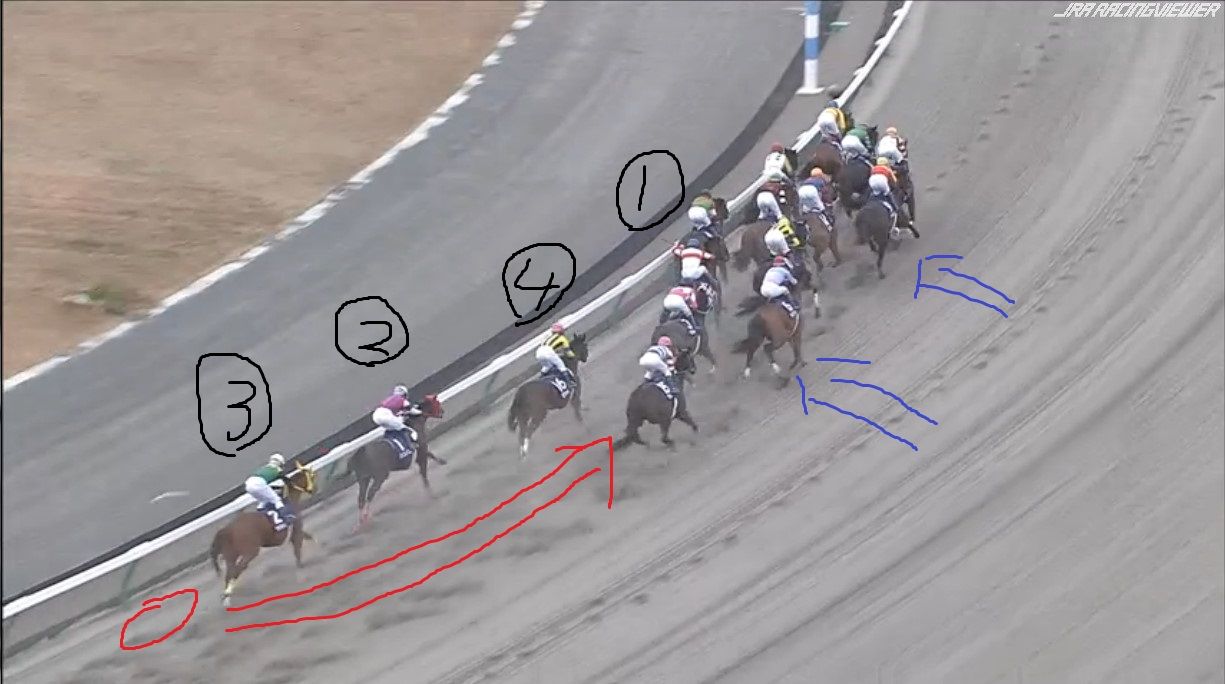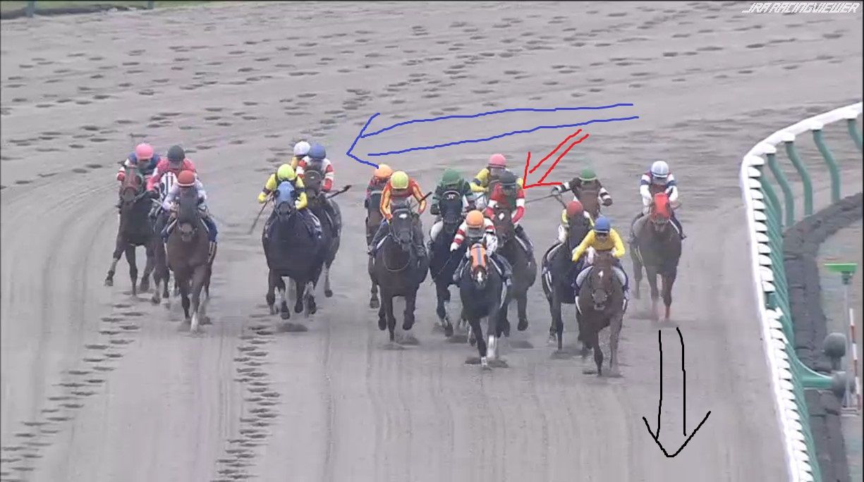 大外にいた2頭が労せずして、内へ。JCのナイトフラワーやショウナンパンドラと同じですね
