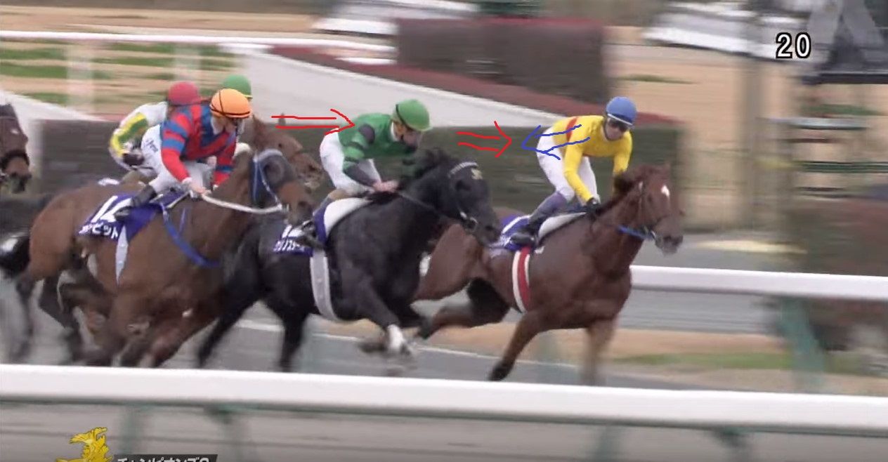 そして、失速するローマンと、内に併せにいくサンビスタを見て、また手綱を外へ(肘を見てもらえば分かります)