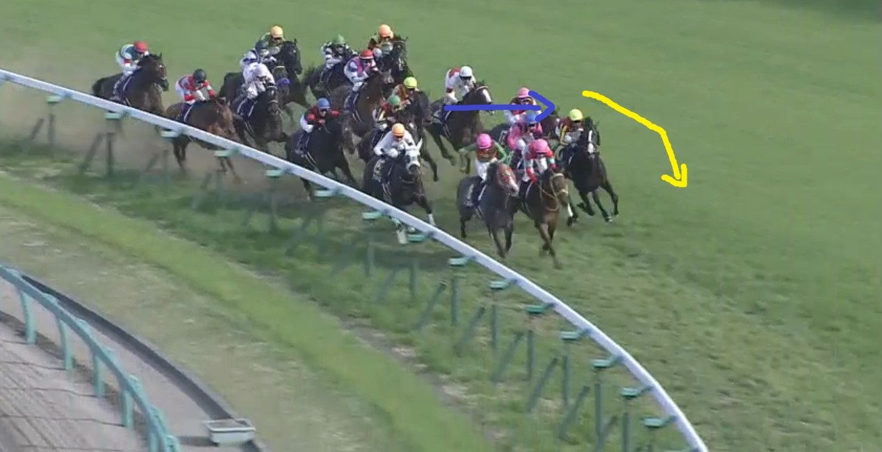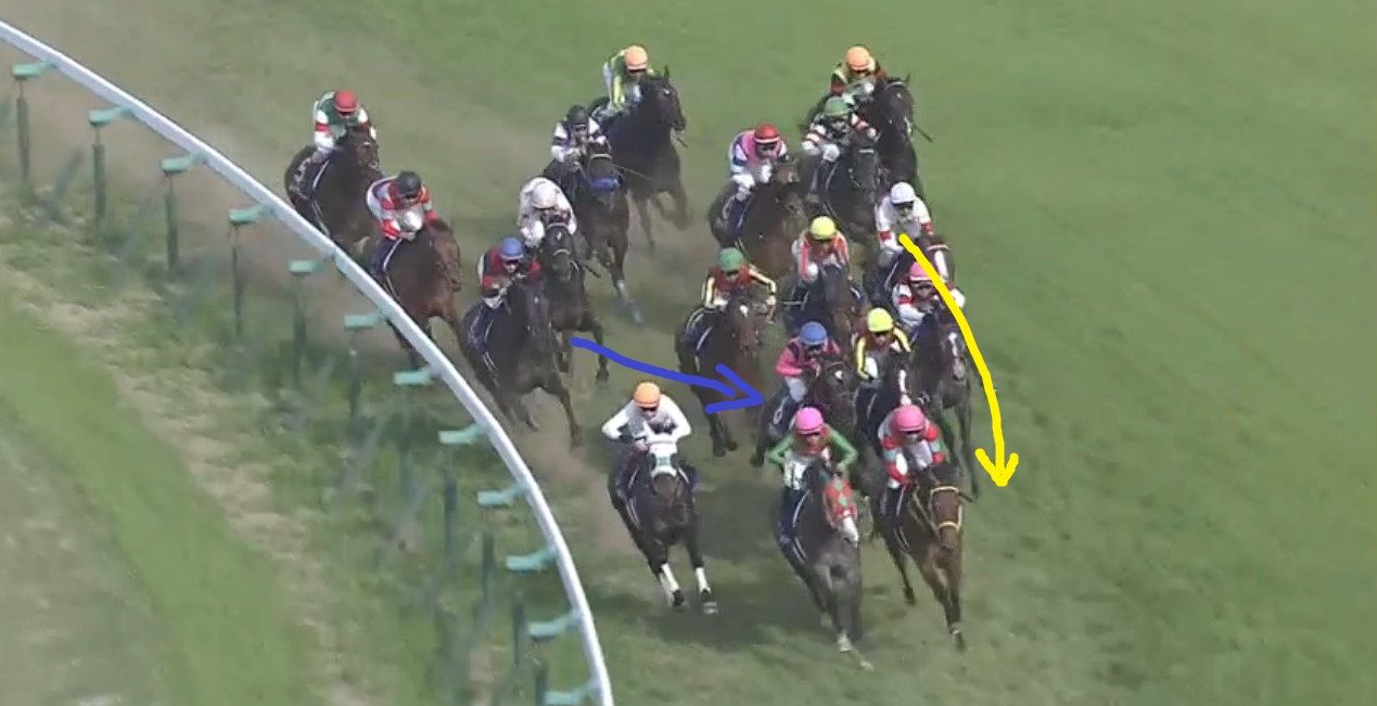 しかし、半ば強引に岩田騎手がタックル!ダンビュライトを突き飛ばして外へ進路確保!