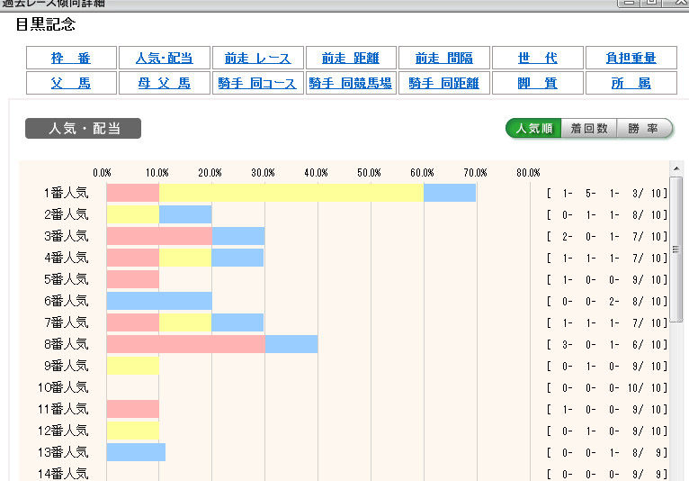 1番人気は勝ちきれないまでも、10年で7回馬券に絡んでいることを考えれば、3連複の軸として考えてもいいかもしれませんね。